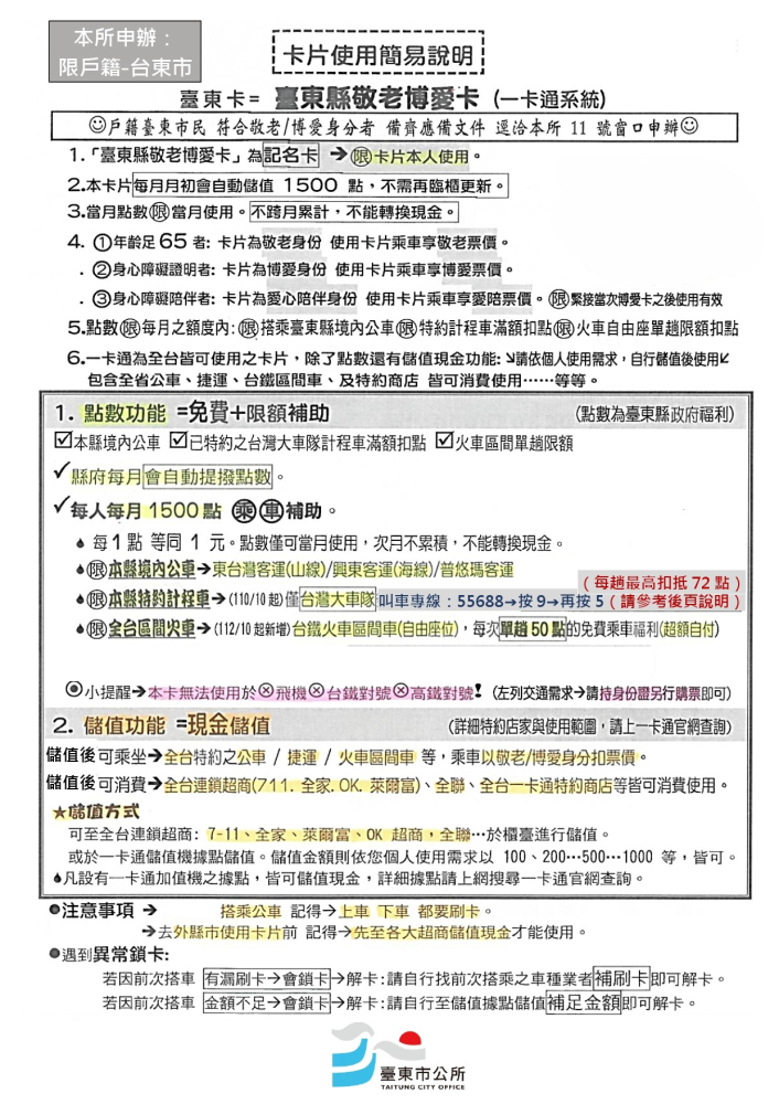 ● 縣府每月補助1500點,限當月使用且不累計,當月補助額度用畢,需自費儲值。 ● 限臺東縣境內公車、臺東縣境內愛心計程車(55688台灣大車隊)及 全臺 臺鐵區間車(自由座位車種) 限額補助。 ● 有提供一卡通服務之大眾交通工具,特約商店,自行儲值現金後亦可使用。 |