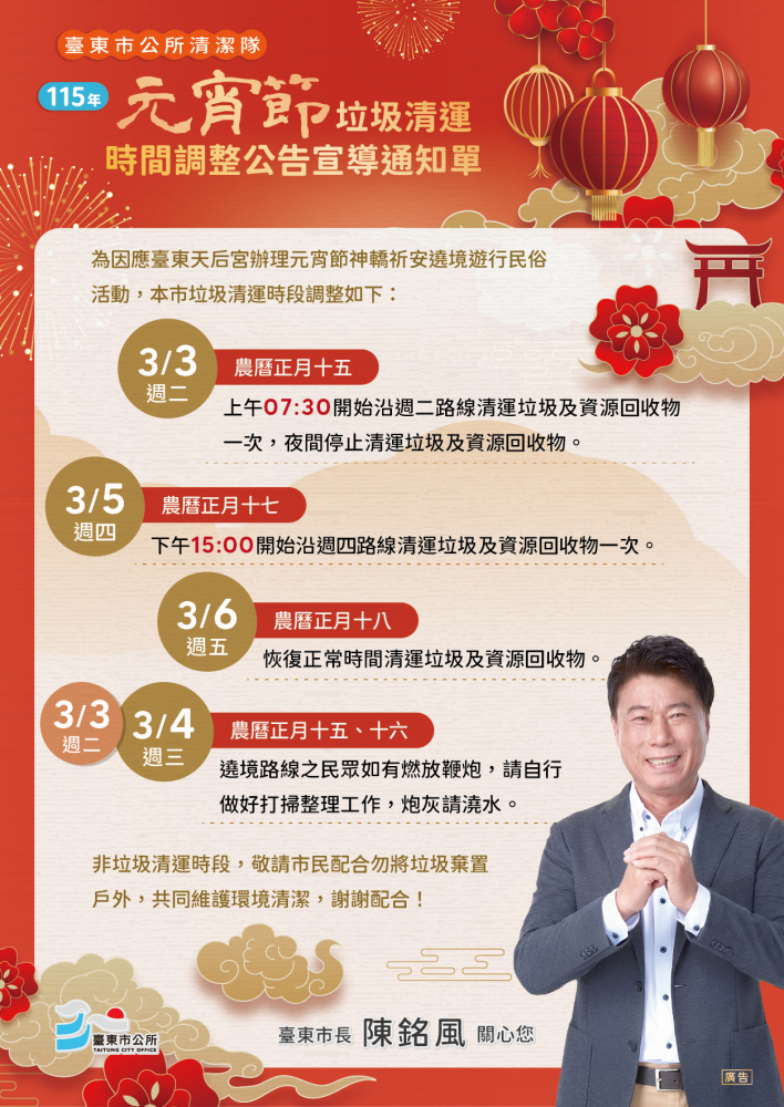 臺東市公所115年元宵節垃圾清運因臺東市區辦理元宵繞境活動,清運時段有所變動,請市民朋友參考宣傳單之內容。