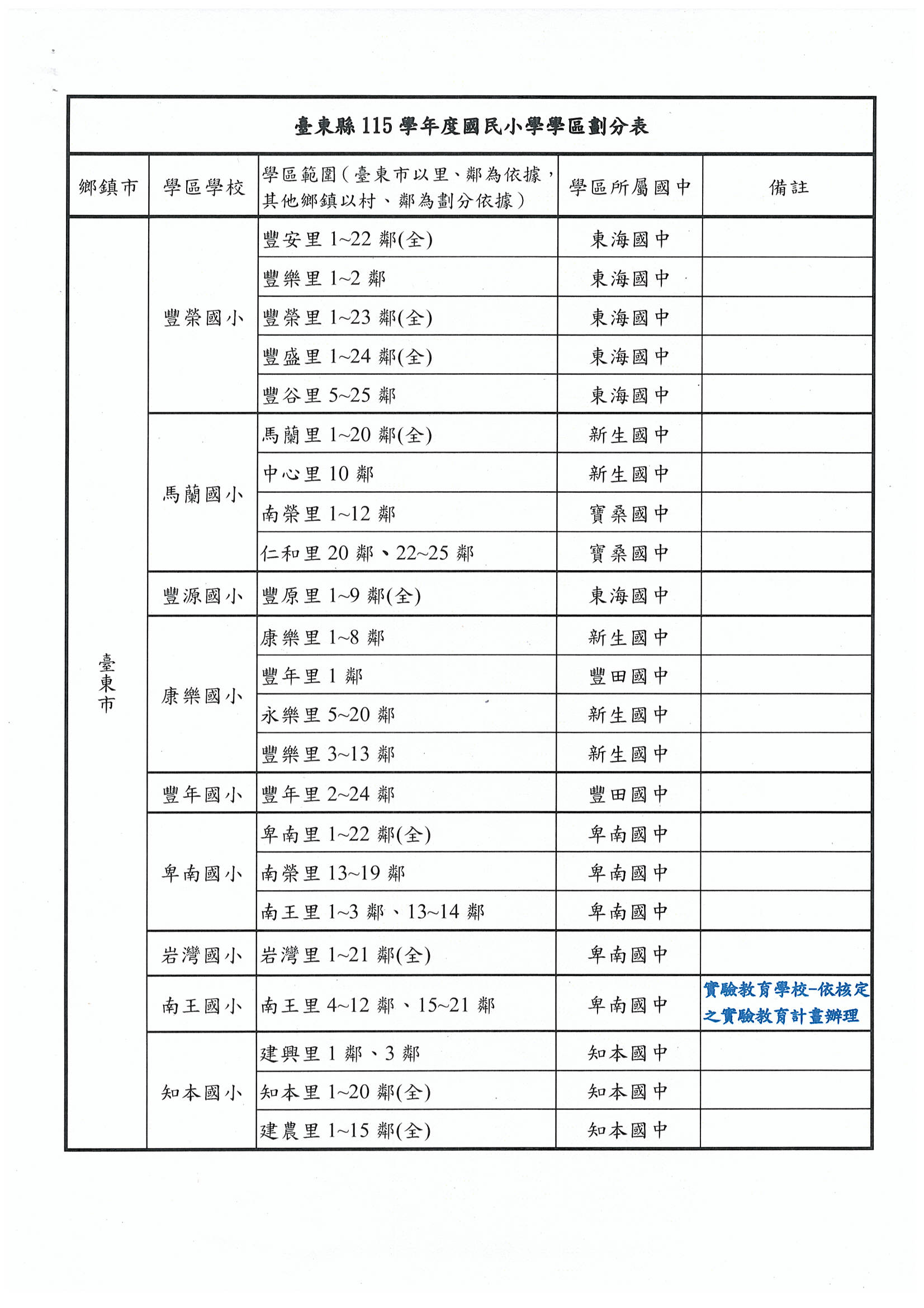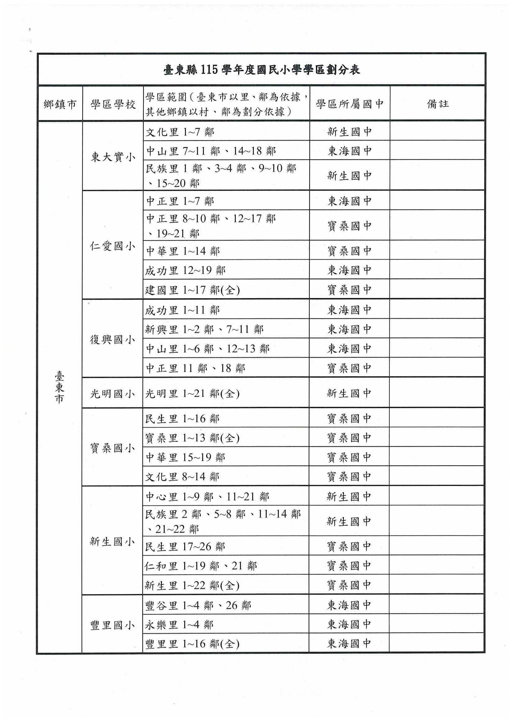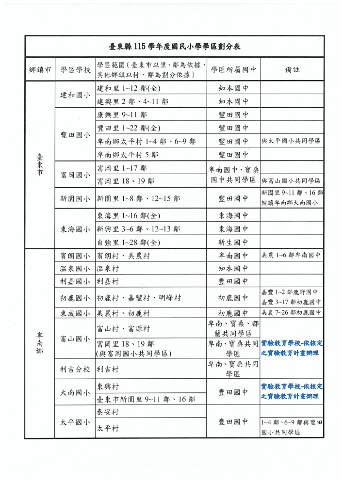 臺東市115學年度國民小學學區劃分表及作業流程