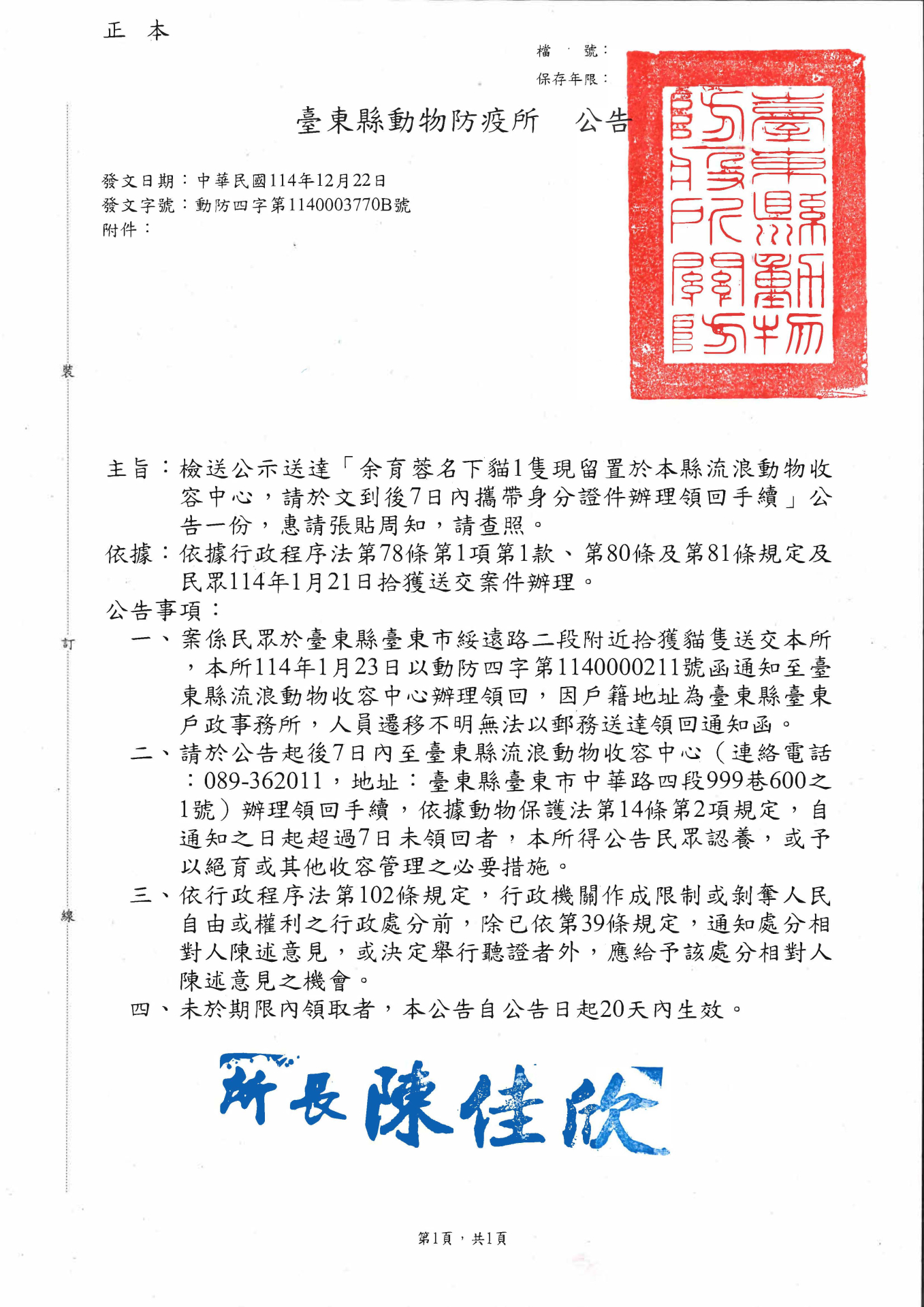 有關臺東縣動物防疫所114年12月22日動防四字第1140003770B號公示送達