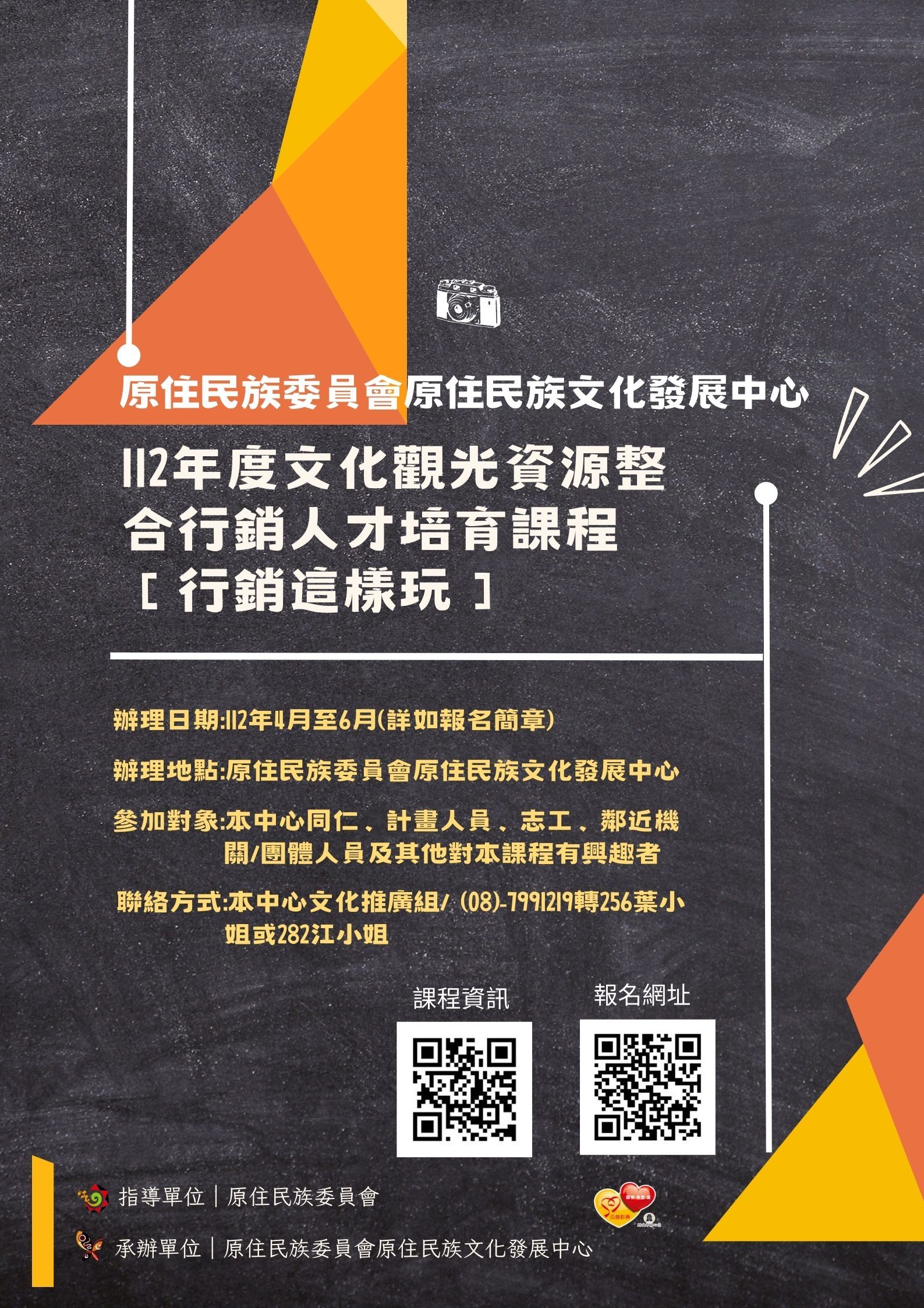 函轉原住民族委員會原住民族文化發展中心辦理112年度文化觀光資源整合行銷人才培育課程【行銷這樣玩】海報乙份
