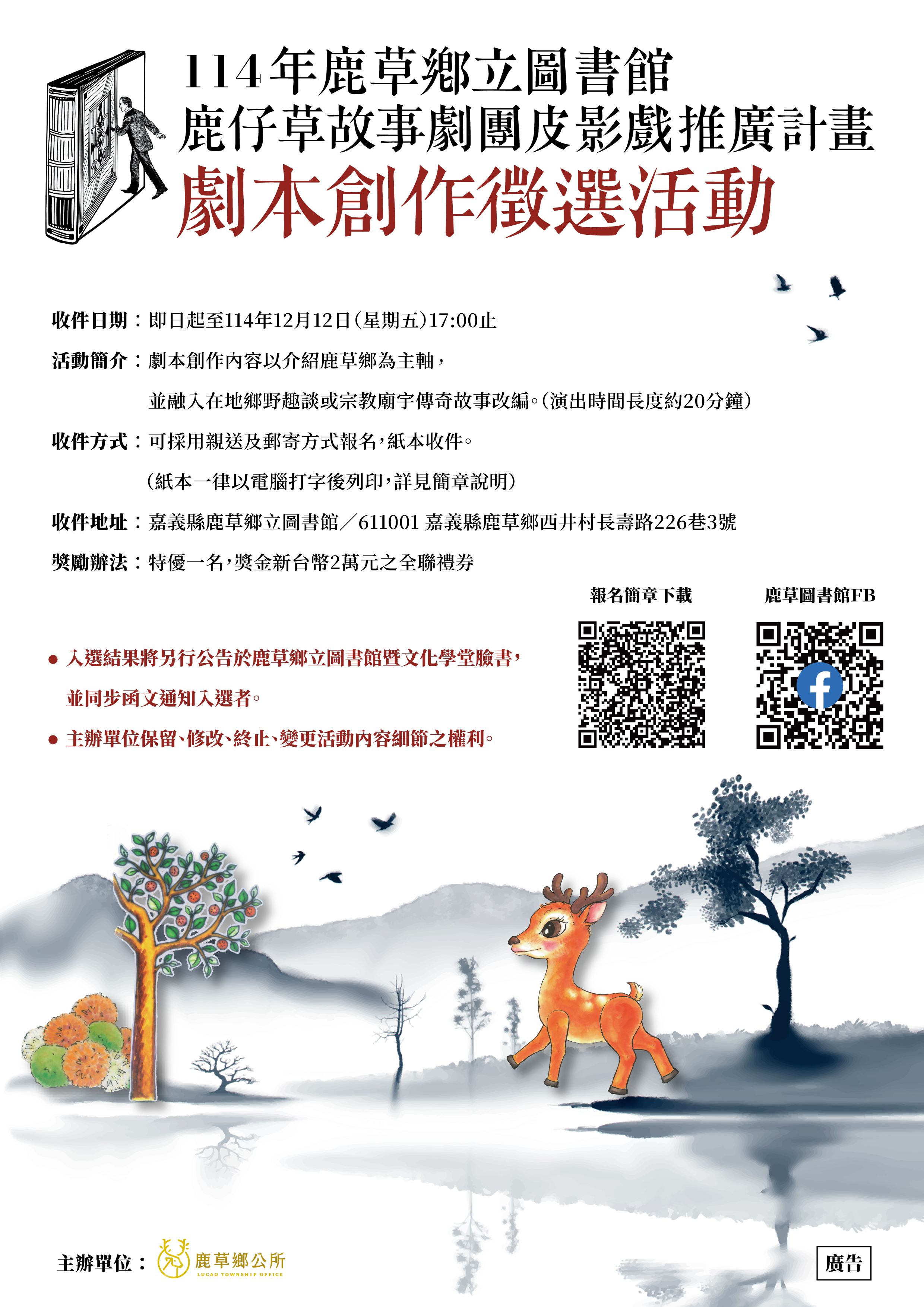 嘉義縣鹿草鄉公所辦理「114年鹿草鄉立圖書館鹿仔草故事劇團皮影戲推廣計畫-劇本創作徵選活動」。
