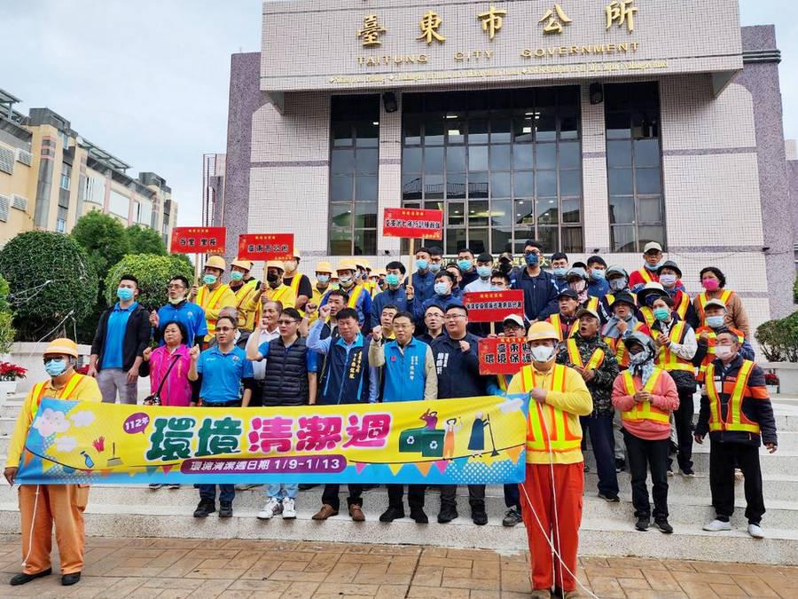台東市公所於農曆春節前夕,響應行政院環境保護署推行「環境清潔週」環境整治政策,清潔隊特別安排1月9日上午8時30分,於市公所大門廣場揭開活動序幕,由市長陳銘風主持,動員各里里民、轄區國軍弟兄及各相關協力單位,確實執行維護巿容整潔,提昇環境美化;活動期間自112年1月9日至1月13日止,敬請民眾配合協助垃圾清運。