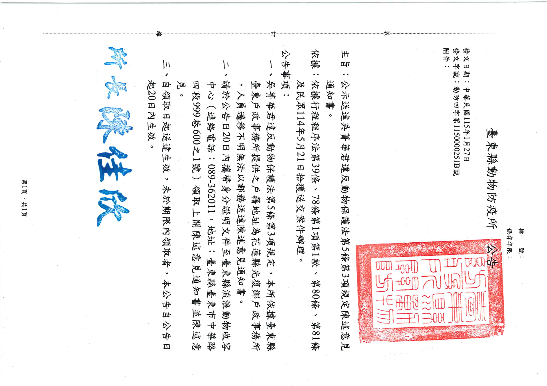 有關本縣動物防疫所「公示送達吳菁華君違反動物保護法第5條第3項規 定陳述意見通知書」公告,