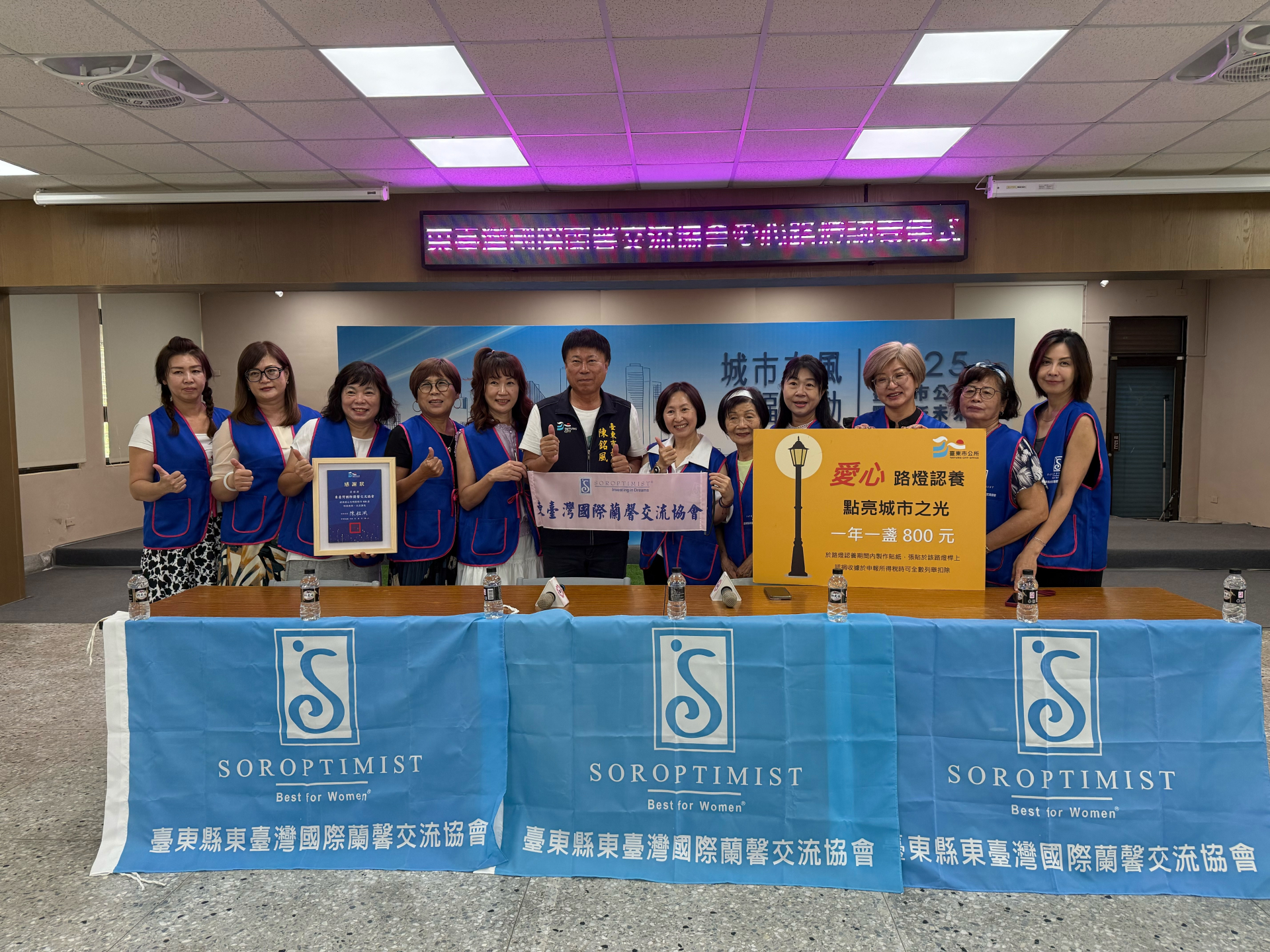 臺東市公所推廣認養路燈多年,在各界的積極響應下,成果頗佳。東臺灣國際蘭馨交流協會熱心公益,也在市長陳銘風的號召下,響應愛心認養路燈活動,今(114)年愛心認養100盞,捐款總額8萬元整,市公所在(3)日下午兩點,在臺東市公所三樓大禮堂舉行表揚活動,感謝東臺灣國際蘭馨交流協會的善心善行。