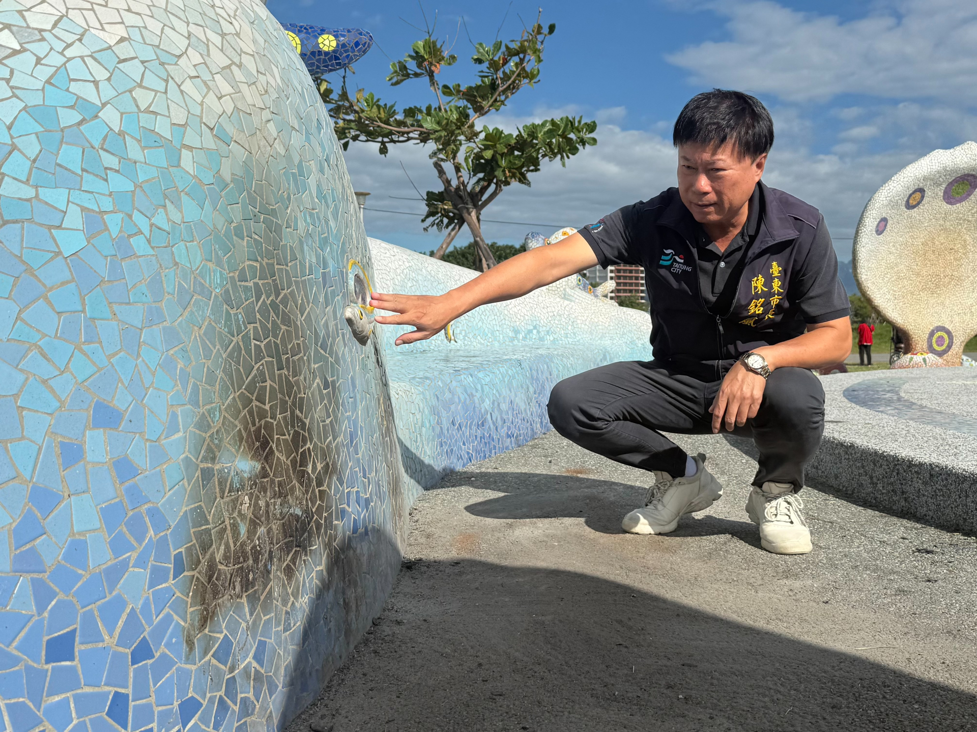 <p>市公所公園管理班於接獲通報後立即前往現場處理,並進行初步清潔及安全維護措施。但因局部磁磚受損較為嚴重,仍需後續施作才能恢復原貌。</p>