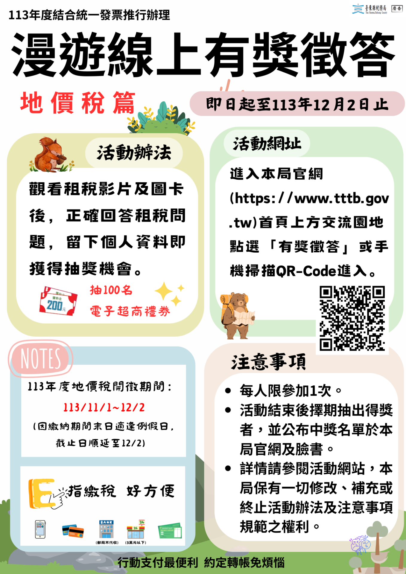 活動詳情請參閱本局官網/交流園地/有獎徵答(https://www.tttb.gov.tw)專區或掃描附件之QR-Code查詢。