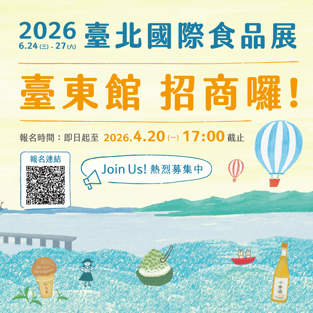| 二、 | 「2026年臺北國際食品展」係亞洲具指標性之食品展,亦是進入亞洲食品市場之最佳平台,展覽自本(115)年6月24日(星期三)至6月27日(星期六)於臺北南港展覽館1、2館展出,並由臺東縣政府統一設計臺東館意象,提升宣傳引客效益,增加買主通路合作意願。 |
