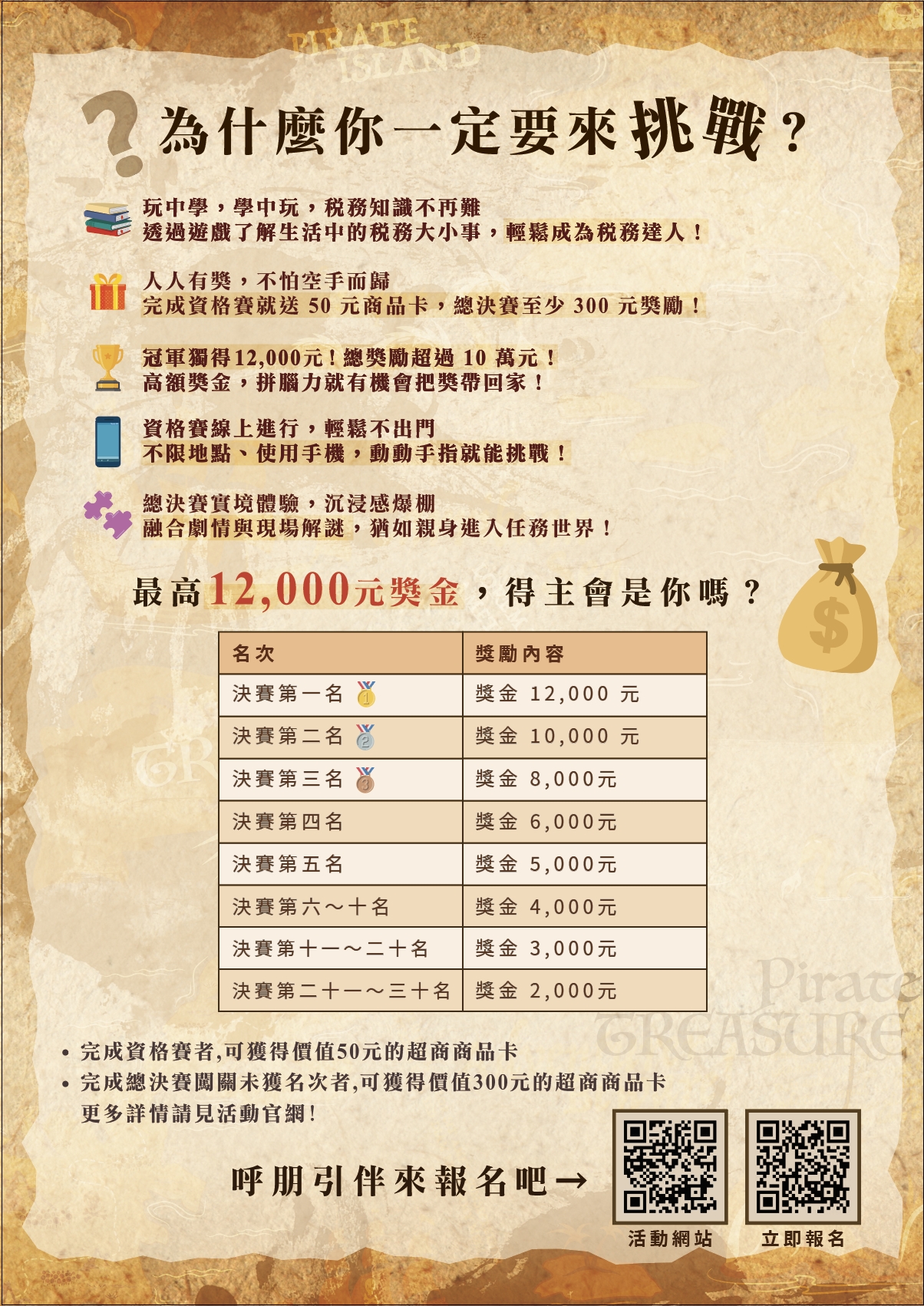 | (六) | 活動方式:將稅務資訊結合解謎任務,用年輕世代的語言與學生族群近距離互動,建立學生正確納稅觀念及瞭解統一發票相關措施,活動辦法如下: |