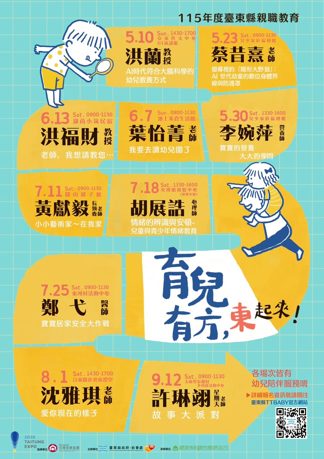 臺東縣政府為推動育兒支持及提升家庭教養功能,辦理「東」起來!115年度親職教育講座,透過系列課程強化家長教養知能與照顧能力,歡迎有興趣之民眾踴躍報名參加。