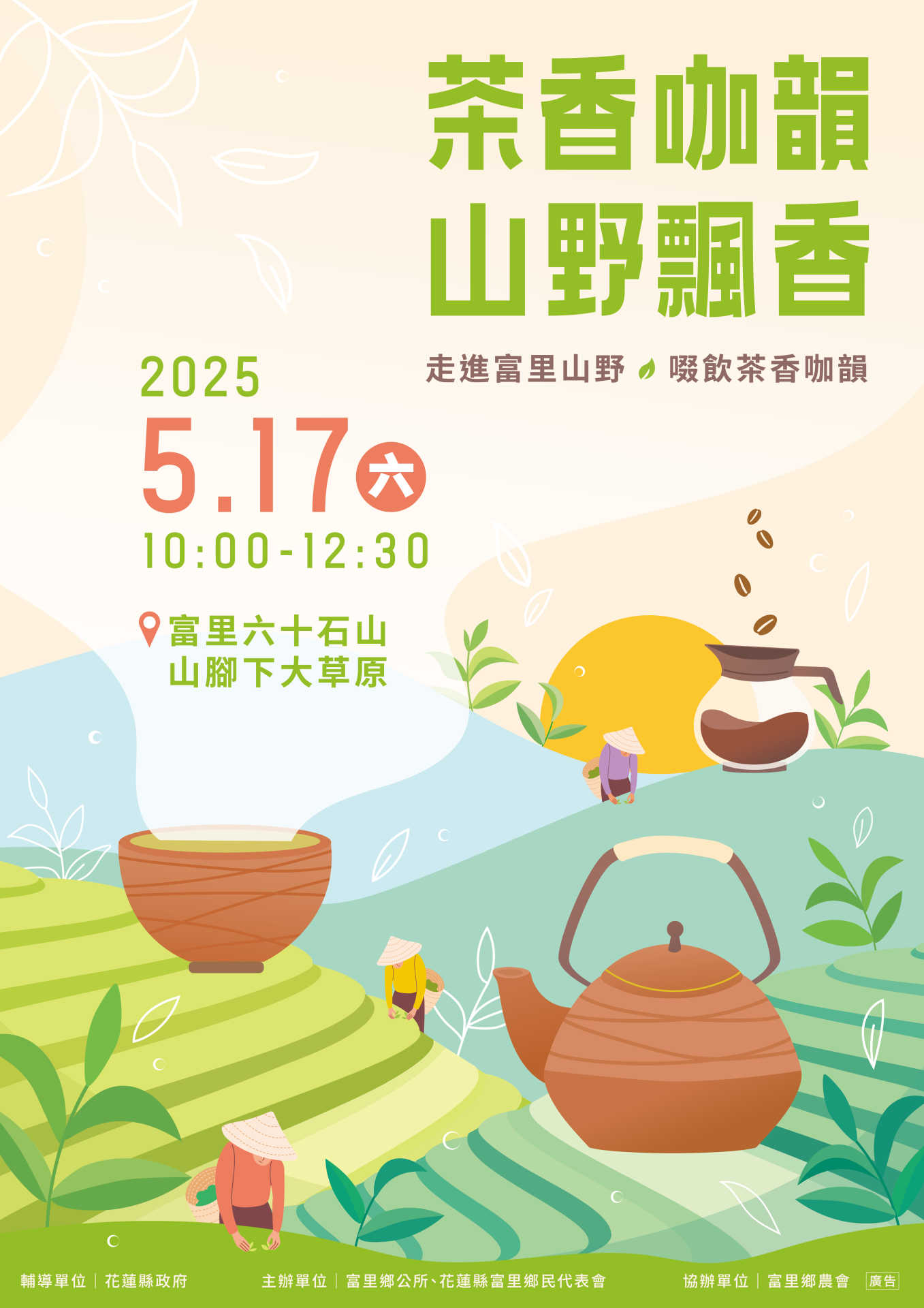 一、活動資訊: (一)時間:2025年5月17日(星期六)上午10時至下午12時30分。 (二)地點:富里六十石山山腳下大草原(台九線293K往六十石山入口進入,直行約900公尺處)。 (三)活動內容:茶與咖啡品飲、音樂演出、風味點心。 (四)費用:全程免費(品飲與點心數量有限,送完為止,無需報名)。 二、旨活動內容逕上花蓮縣富里鄉公所臉書粉絲專頁(富里鄉公所)。