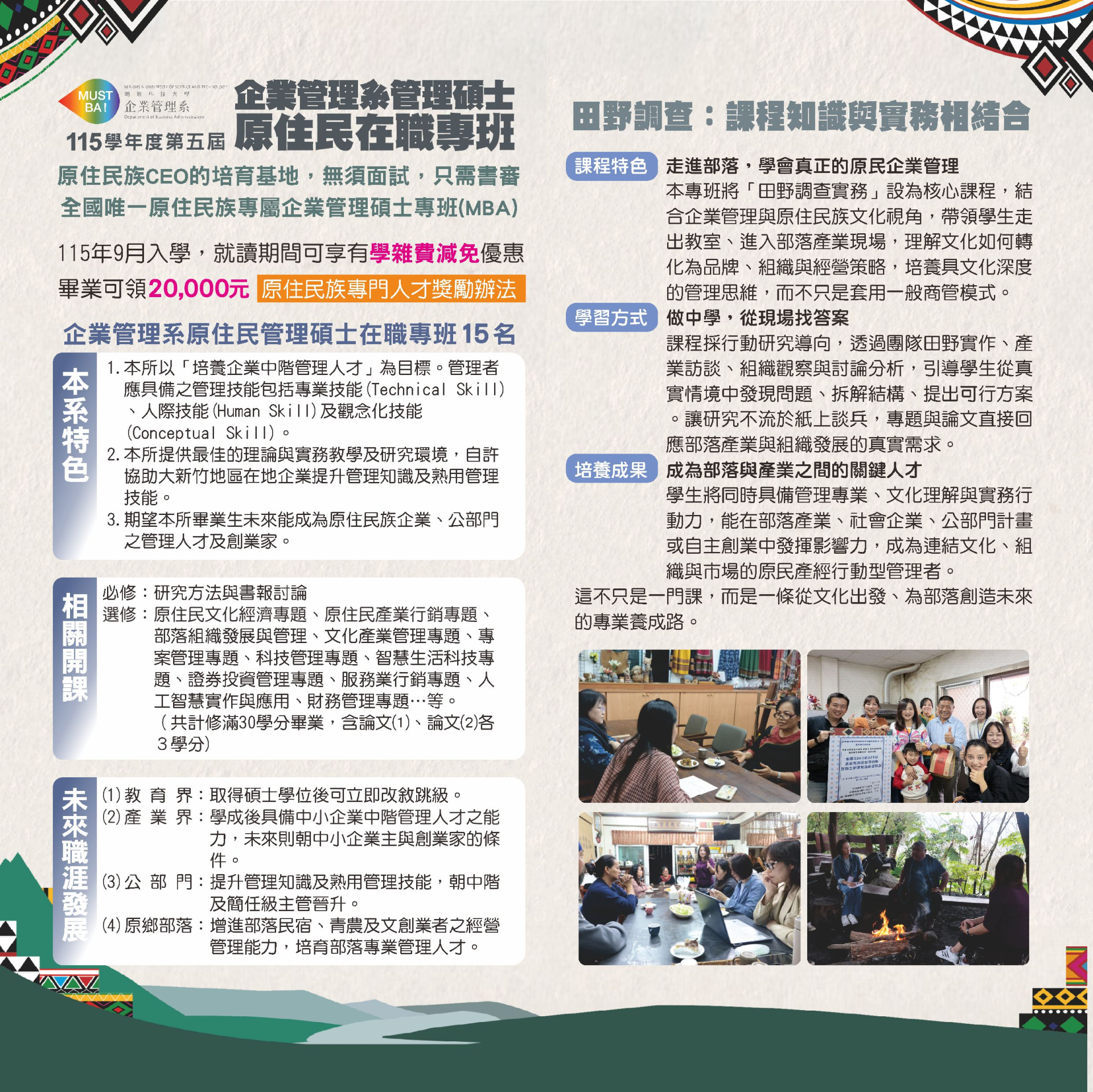 | (三) | 期望旨揭專班畢業生末來能成為原住民族企業、公部門之管理人才及創業家。竭誠歡迎對原住民族相關議題有興趣之學生報考。 |
