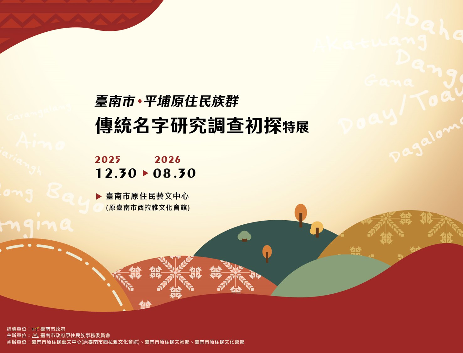 為呼應《平埔原住民族群身分法》於2025年10月23日公布施行,本府委託研究團隊從文獻、戶口調查簿、族語資料中探勘傳統名字,彙整並歸類成表,初步呈現文獻資料中西拉雅、大武壠、馬卡道、巴宰、洪雅等族群的命名方式(名制)與名字脈絡(名譜),並將研究調查成果展示於臺南市原住民藝文中心。本次展覽除帶領大家認識臺灣平埔原住民族群以外,並彙整其他16族原住民族群傳統名制類型作為比較,期望族人能再次與名字相遇,從中尋回身分與文化的力量。