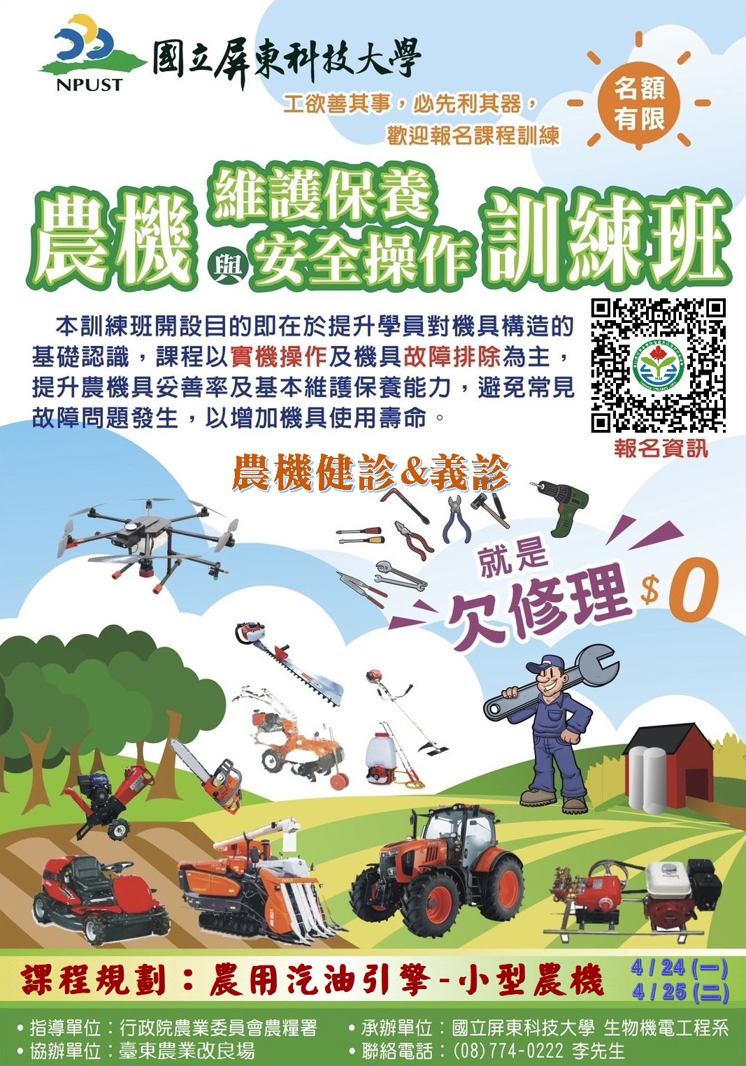 國立屏東科技大學與行政院農業委員會臺東區農業改良場訂於本(112)年4 月24~25日(星期一、二),假行政院農業委員會臺東區農場改良場辦理「農機維護保養與安全操作訓練班」