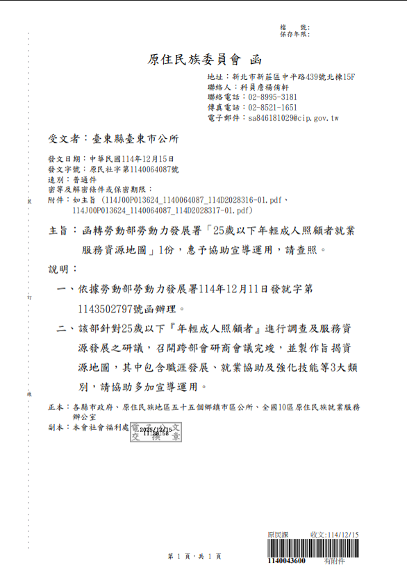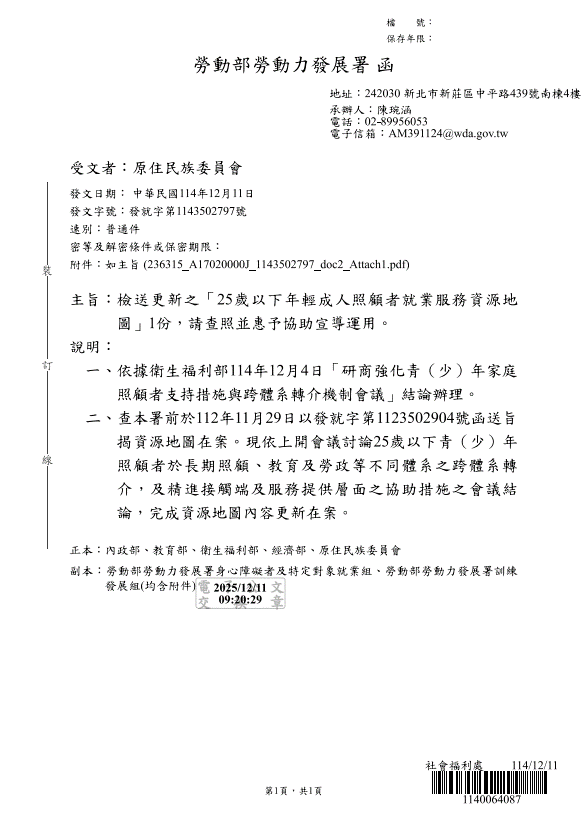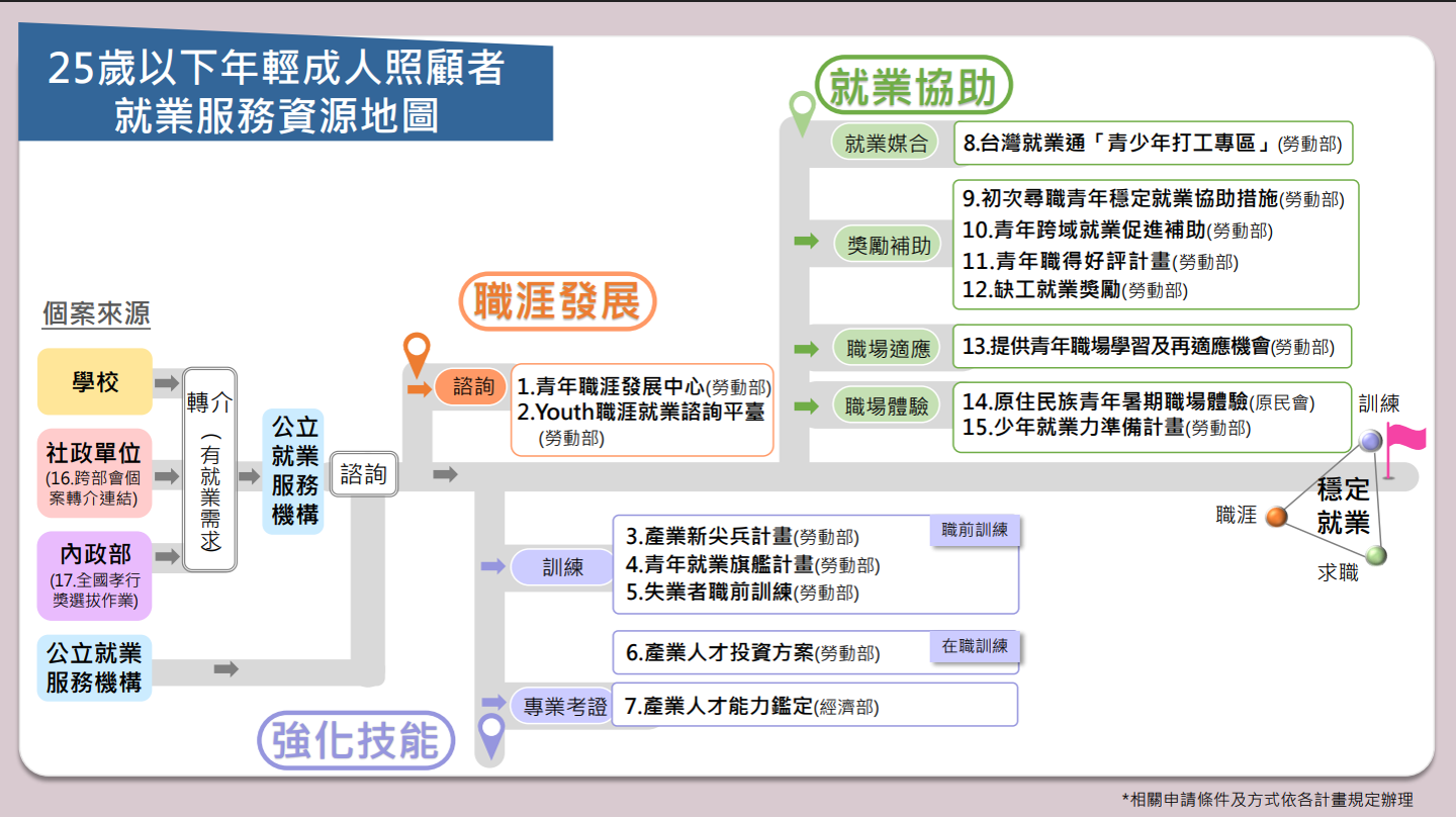 轉知勞動部勞動力發展署「25歲以下年輕成人照顧者就業服務資源地圖」相關資訊