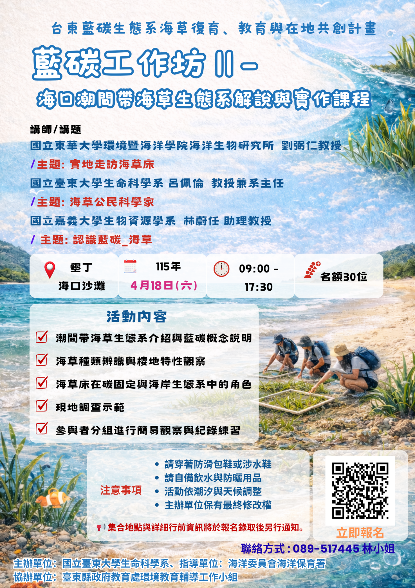 一、為推廣藍碳生態系統與海草碳匯在氣候變遷中之重要角色,本校藍碳團隊特辦理旨揭工作坊,將帶領參與者前往墾丁海口港沙灘實地觀察海草棲地生態。期透過專家導覽、現地觀察與交流分享,提升大眾對海洋生態之認識,並共同探索海洋保育與永續發展之行動方案。