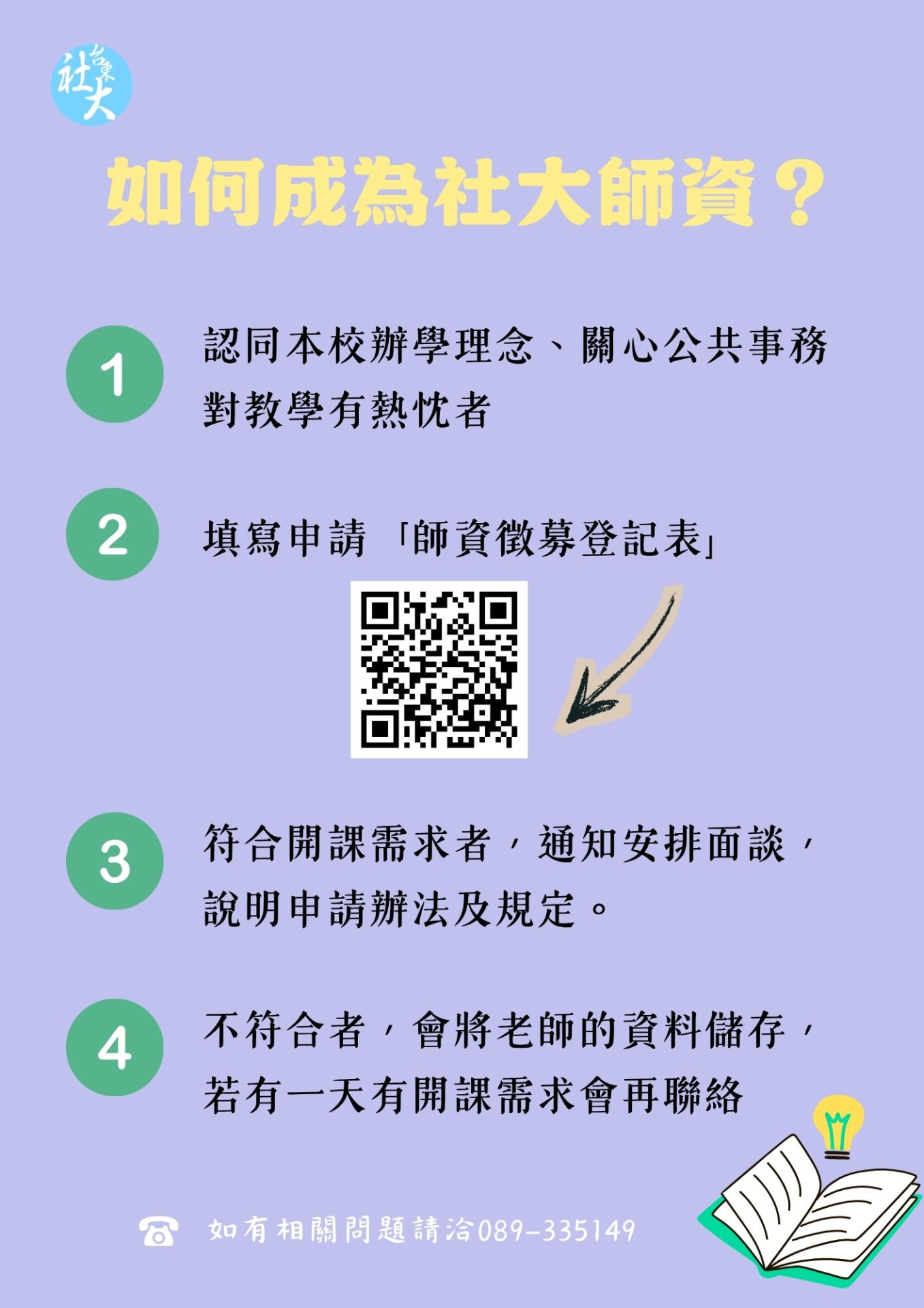 | 五、 | 其餘訊息請參閱徵募DM,歡迎具有相關專長人士(含碩博士生)申請或電洽089-335149。 |
