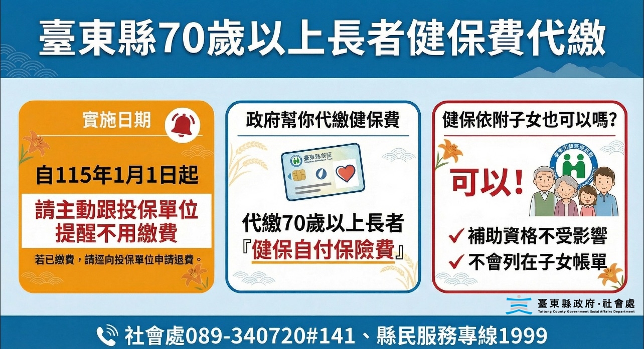 提醒您: 凡符合補助對象者,原投保單位皆無須異動作業(無論是被保人或眷屬),僅須提醒原投保單位於計算健保費時須留意"臺東縣自115年起有新增臺東縣老人70減免的補助福利"。惟因本補助計畫為臺東縣初辦,致符合對象清冊之比對較為耗時,敬請耐心等候縣府社會處造冊完成並報送健保署系統註記減免資格後,屆時,若前期身分因尚未註記而有預繳情形,將由原投保單位自補助對象取得減免身分註記後→自1月起重計補助對象健保保費自付額溢繳之退費事宜。