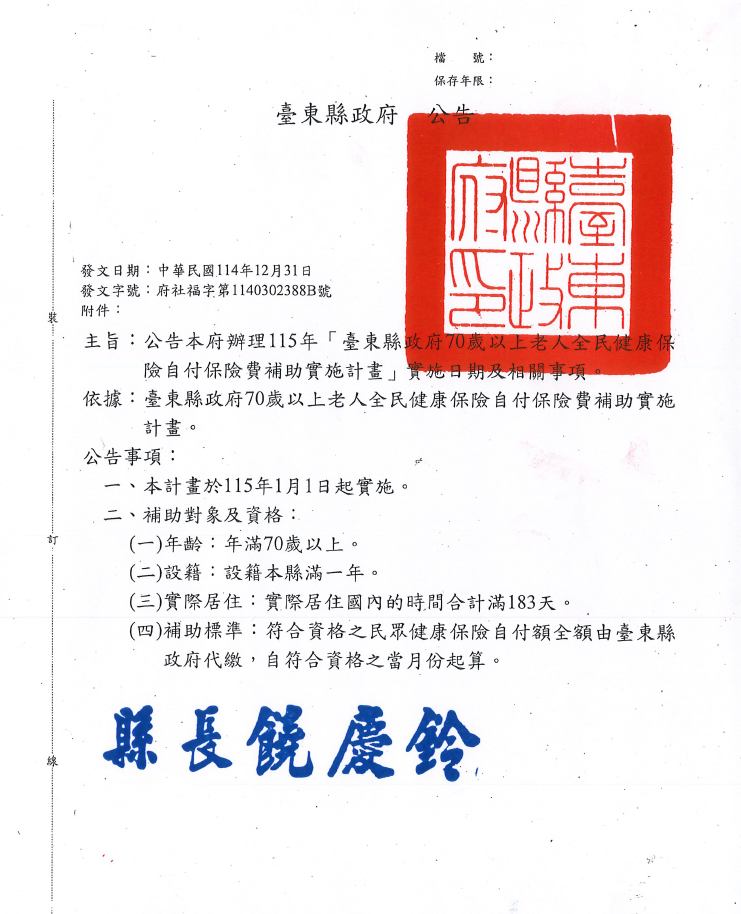 <依據台東縣政府114年12月31日府社福字第1140302388號來函公告>