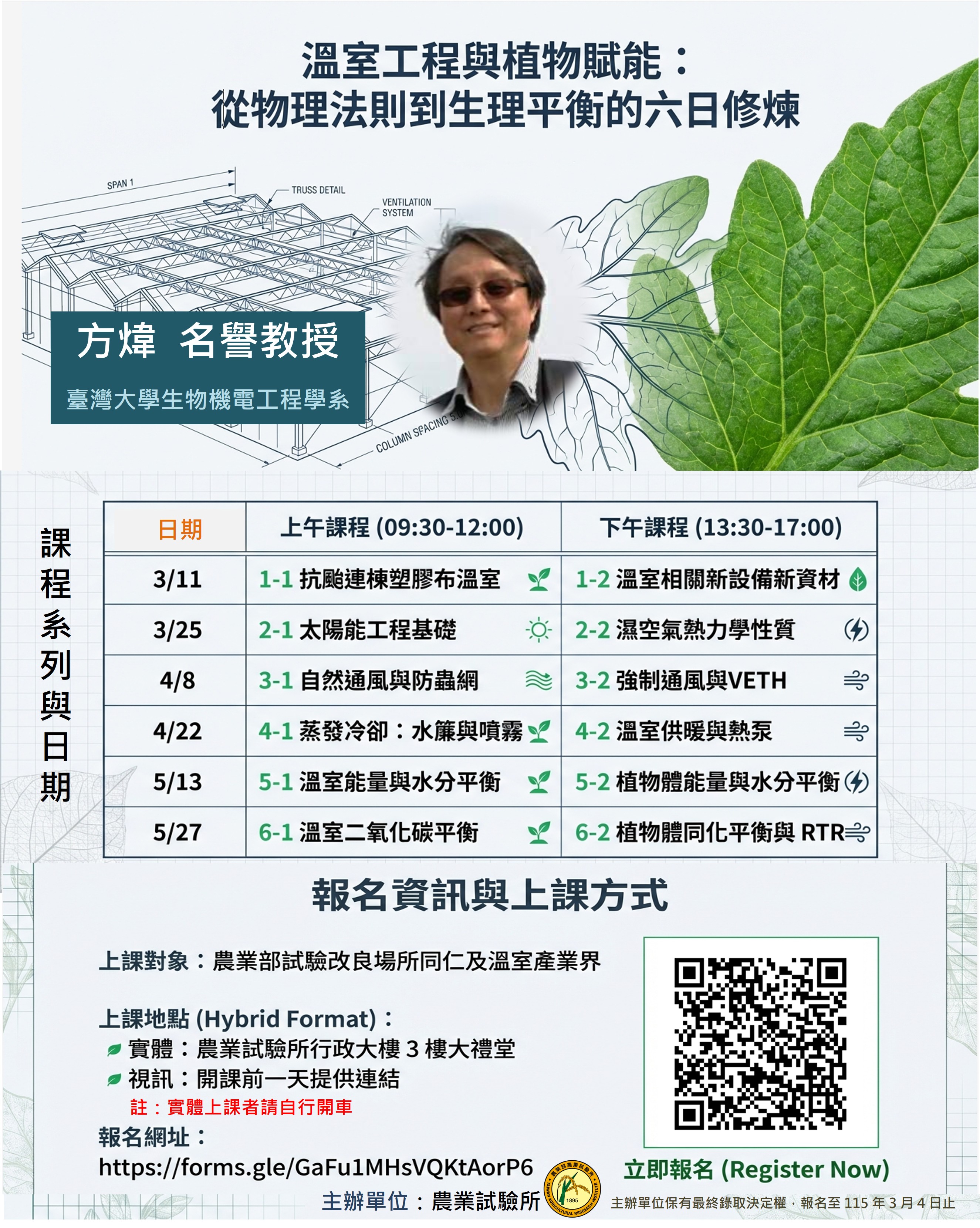 三、課程安排於本(115)年3月11日、3月25日、4月8日、4月22日、5月13日及5月27日,上午9:30至12:00、下午1:30至17:00,於農業部農業試驗所行政大樓3樓大禮堂辦理,以實體及線上方式進行,報名實體上課者請自行前往農業部農業試驗所。