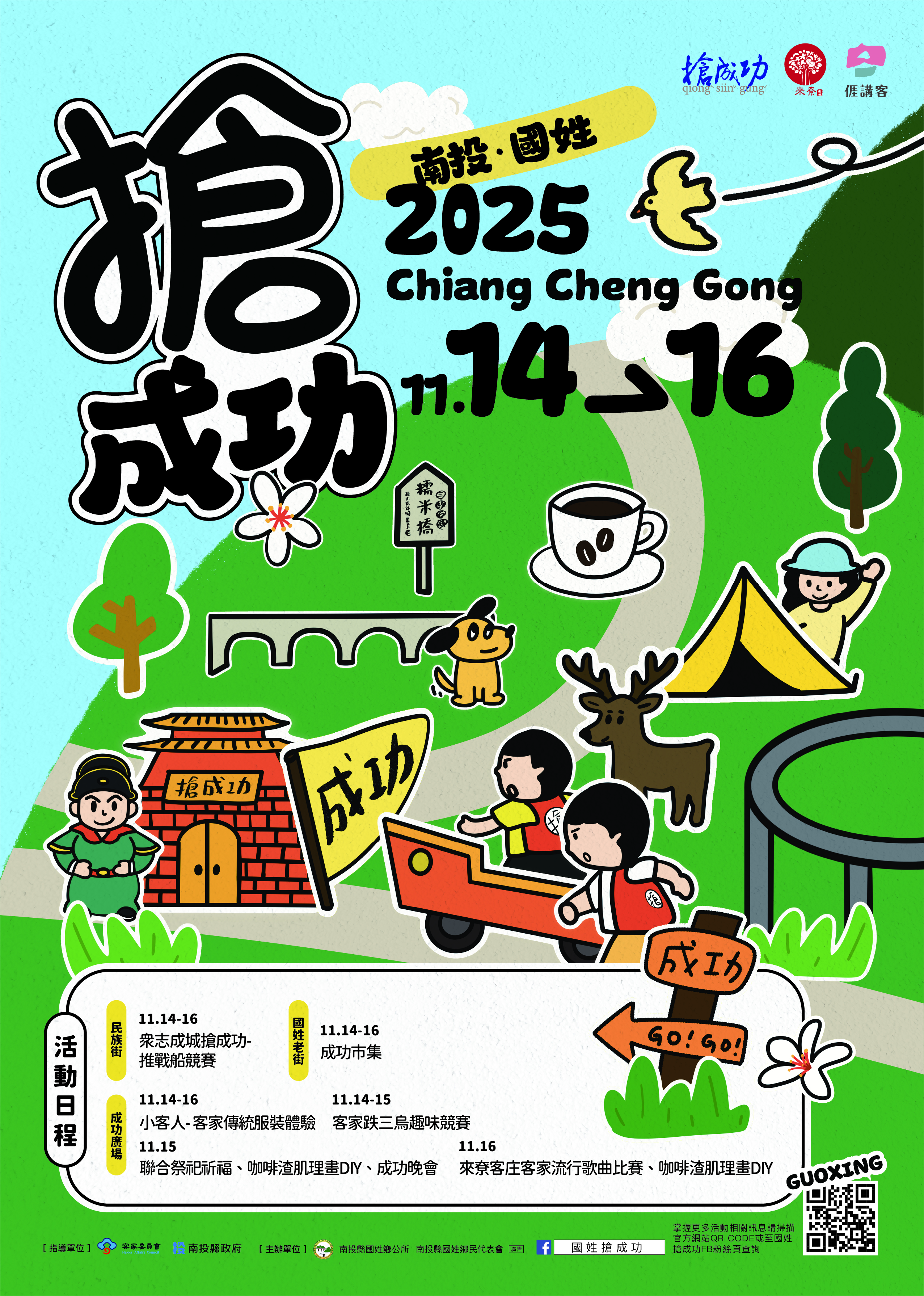 南投縣國姓鄉公所辦理「2025客庄大節-南投.國姓搶成功」系列活動,自114年9月22日(一)至114年10月17日(五)受理推戰船競賽及全國客家流行歌曲比賽網路報名
