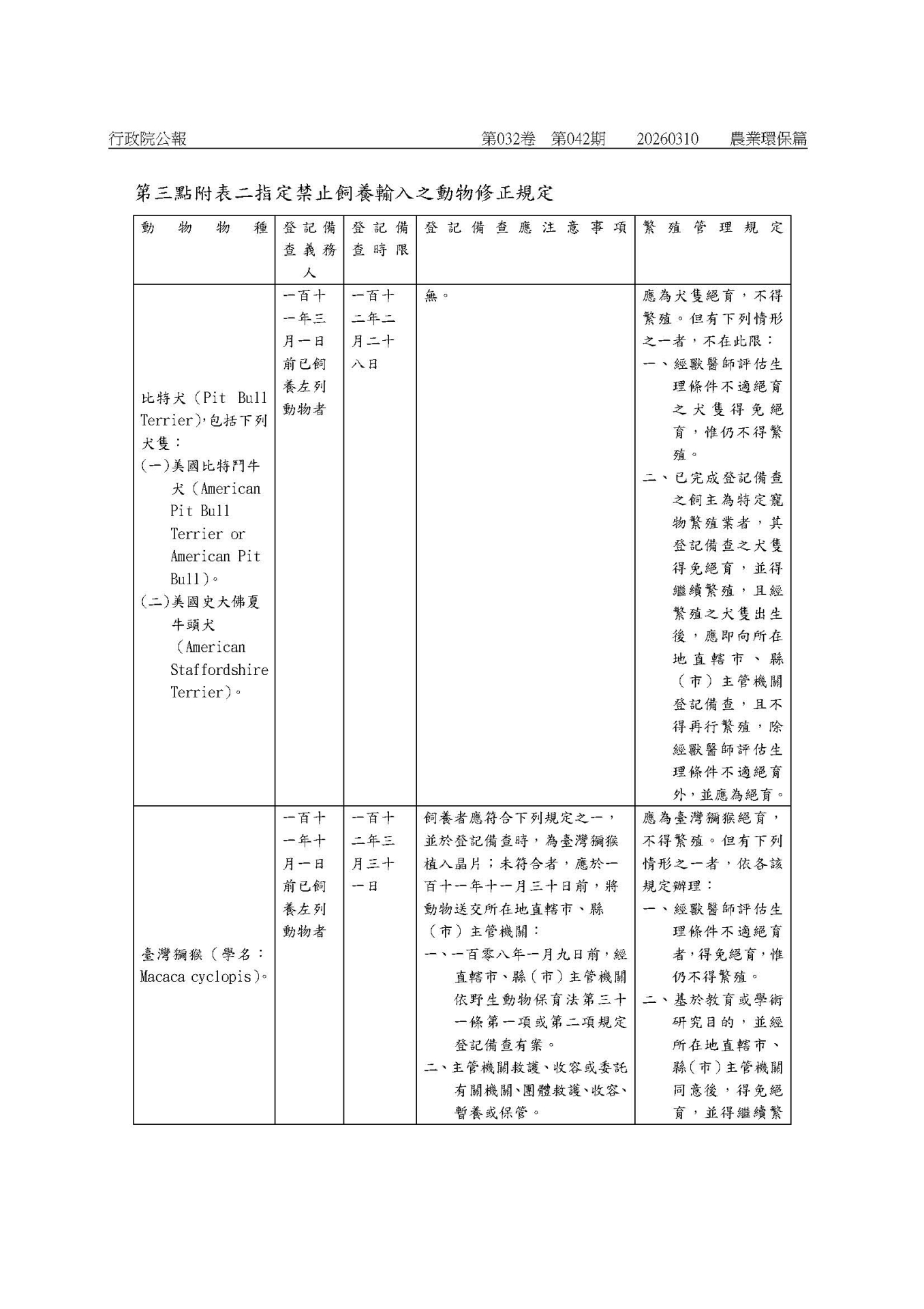 有關農業部115年3月10日農護字第1140073489號「指定禁止飼養輸入或輸出之動物」修正公告詳如附件電子檔案,