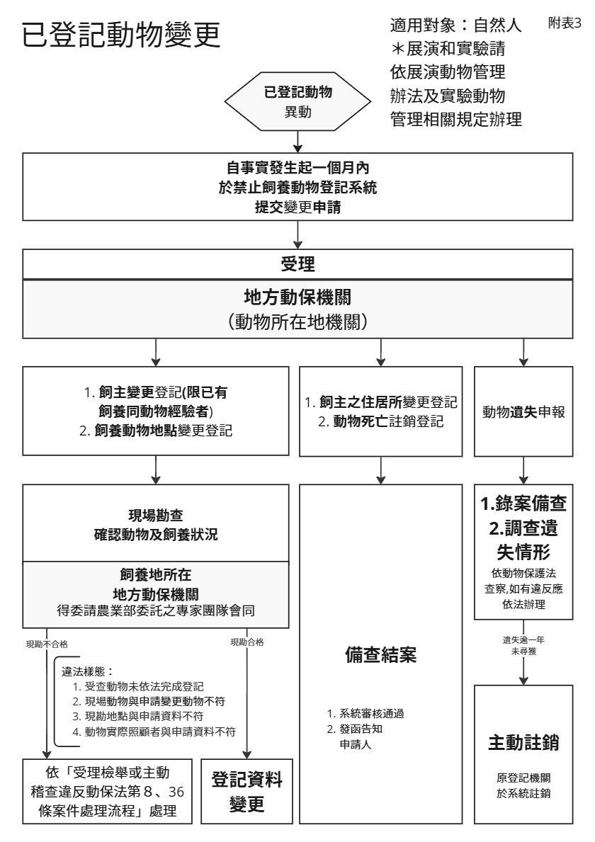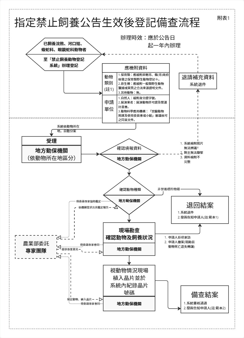 因應公告修正新增「指定禁止飼養之動物」,並自115年5月1日生效,農業部已建置「禁養動物登記系統」(https://www.pet.gov.tw/Web/NotAllowPet.aspx),已於115年3月10日公告日起開放已飼養上述動物之飼主線上辦理登記備查。
