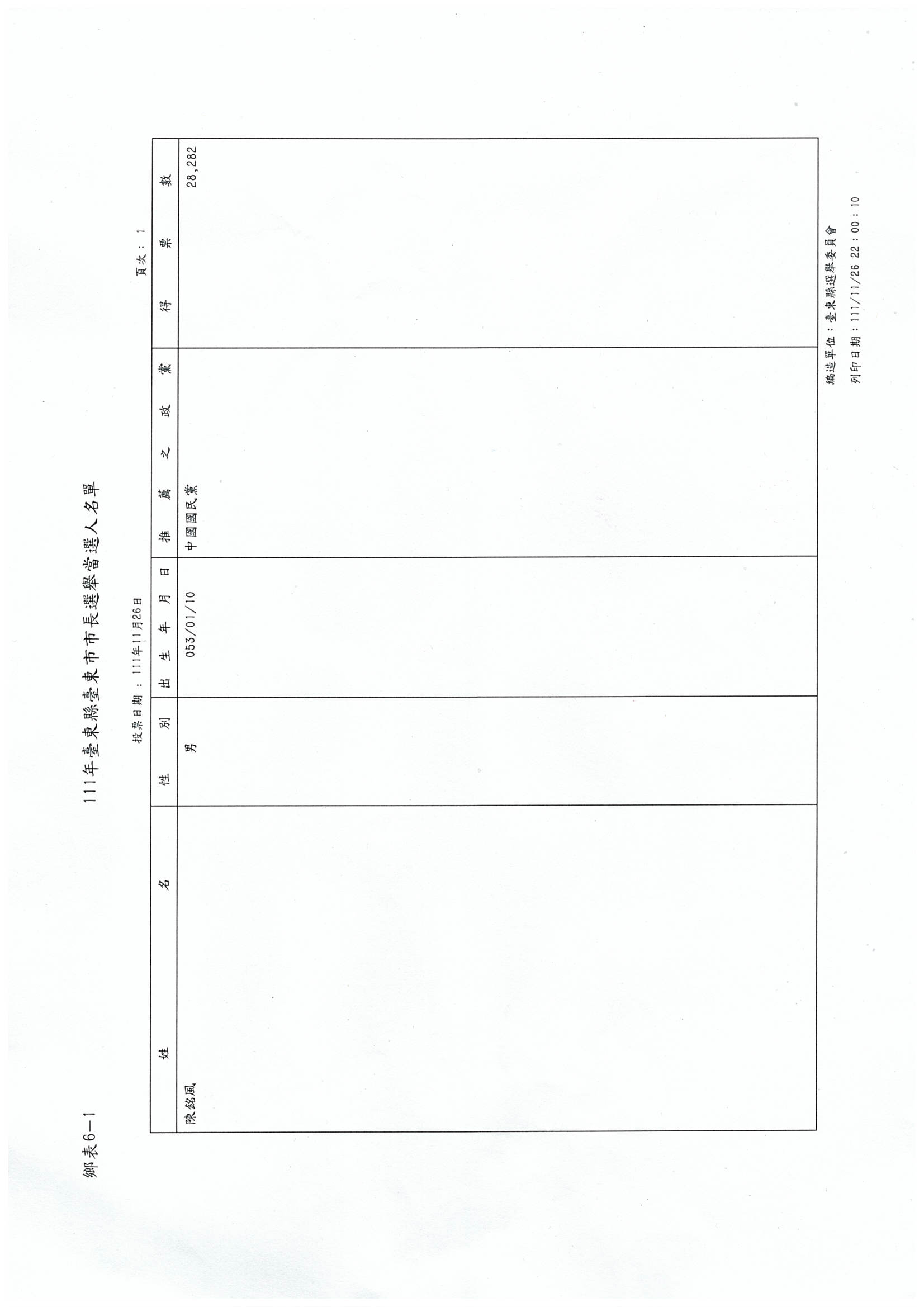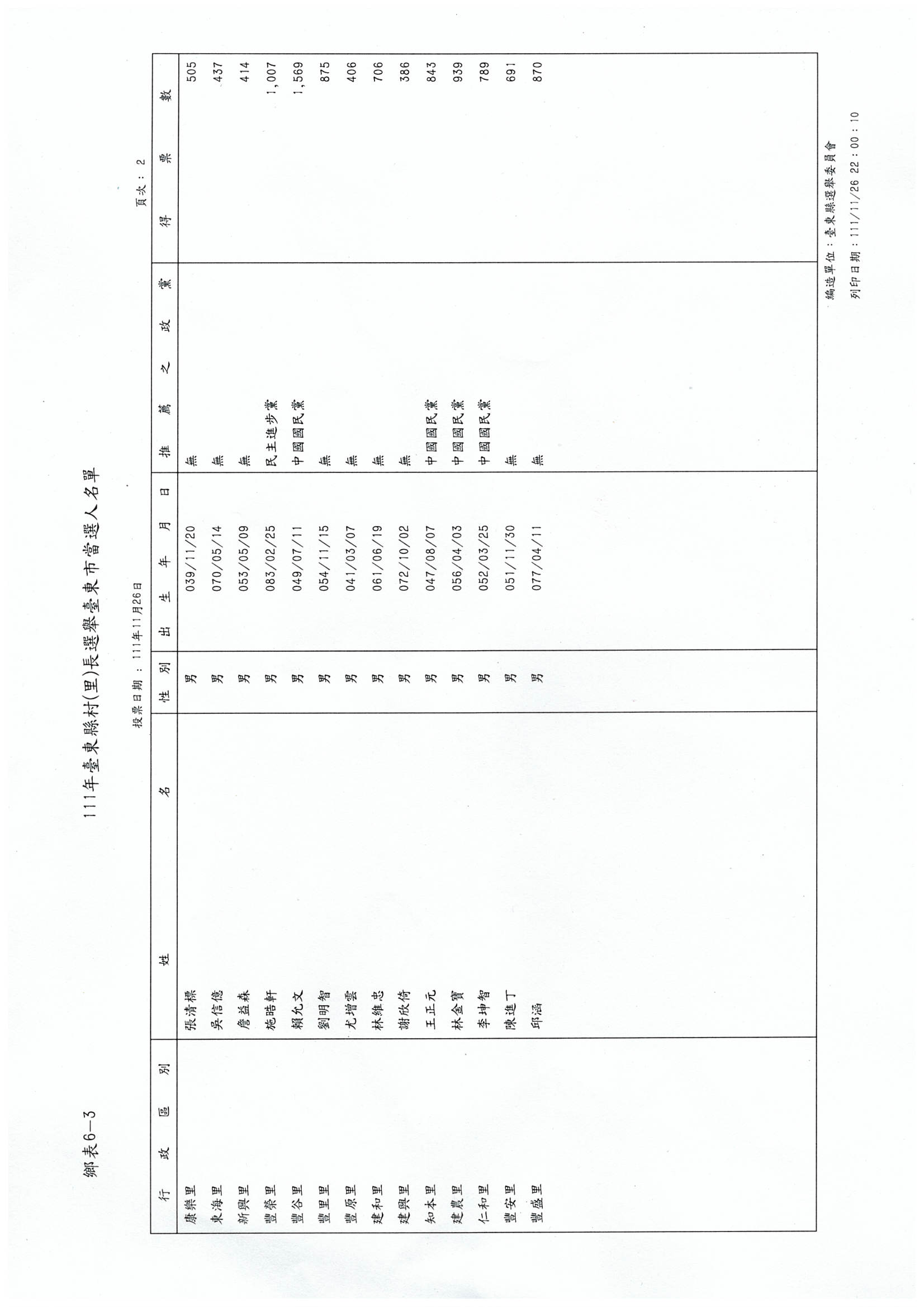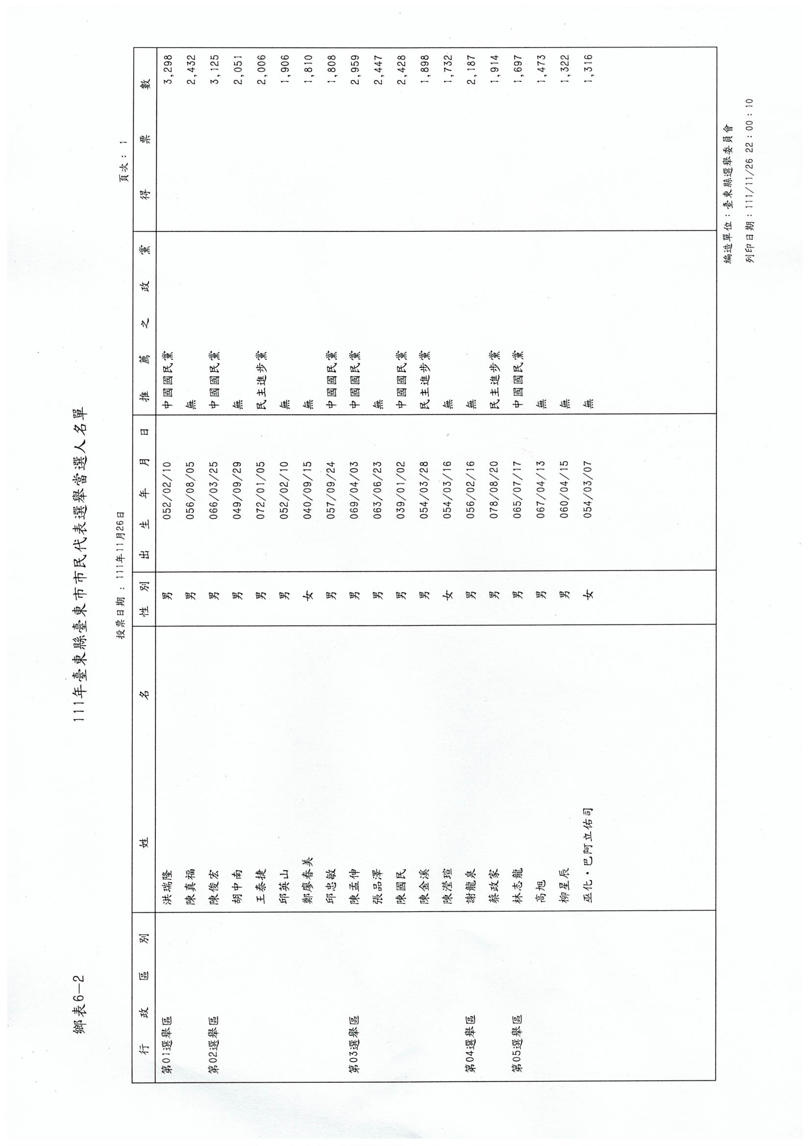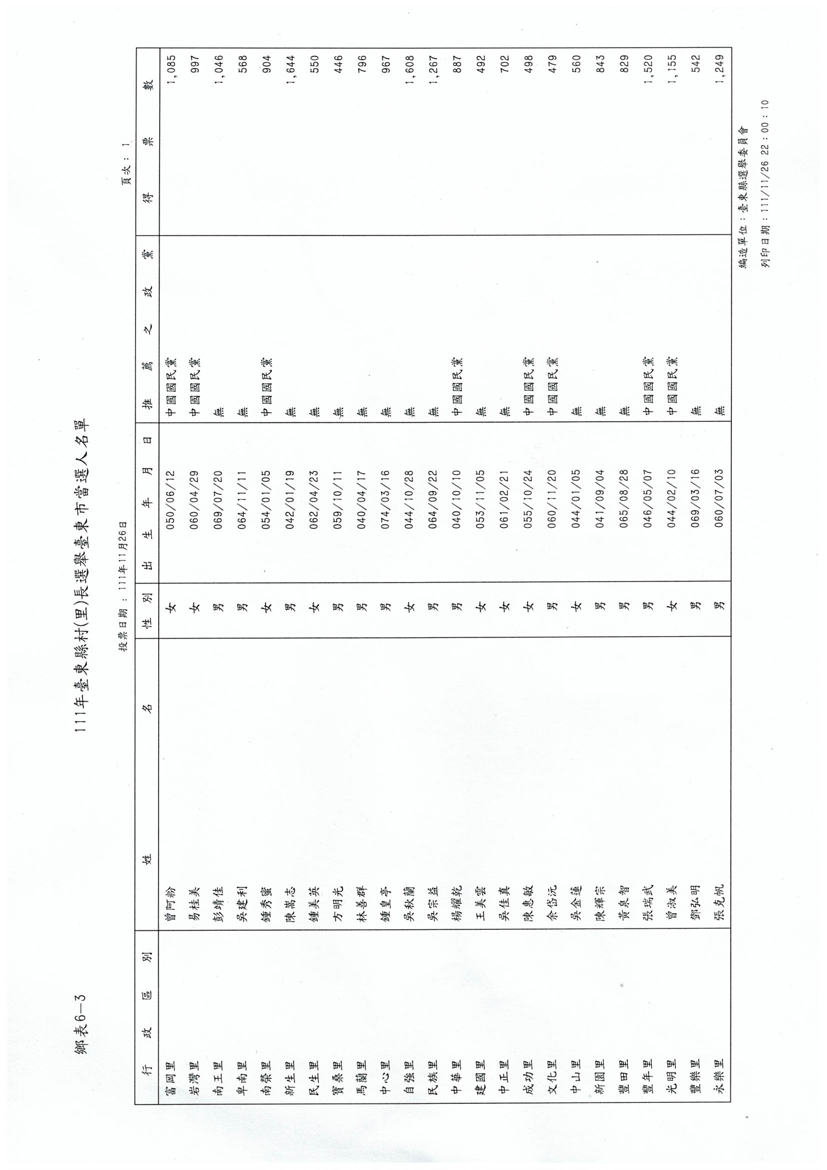 111年臺東縣臺東市市長、代表及里長當選名冊