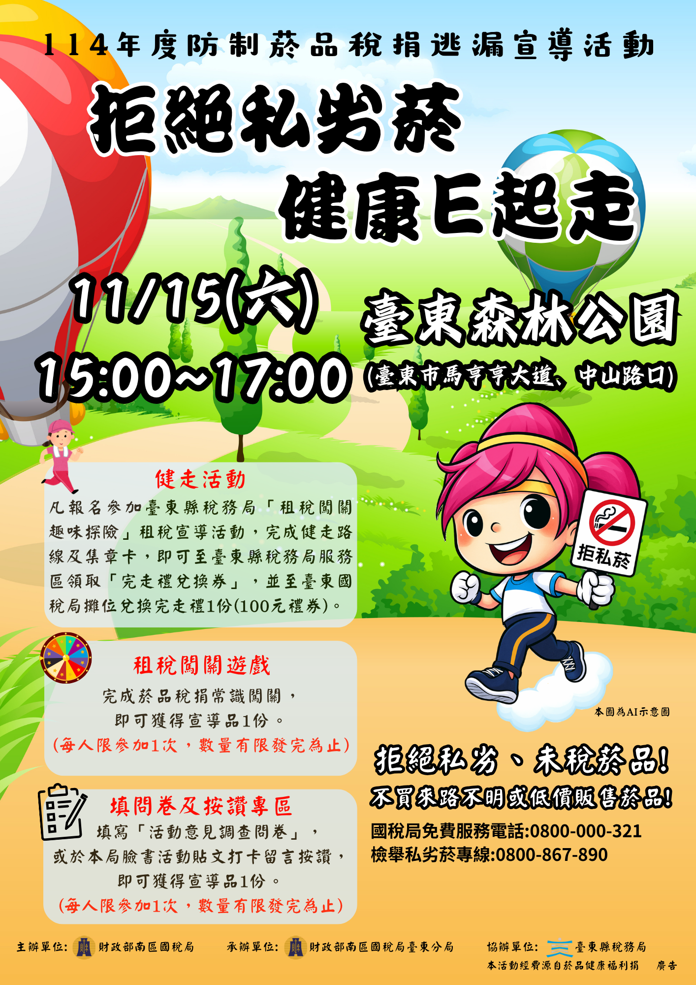 內容:當日於臺東森林公園除了舉辦健走活動外,現場設有「菸品稅捐遊戲闖關」、「填問卷專區」及「臉書打卡留言及按讚」等攤位,各備有限量好禮相送,詳情如附件電子檔。