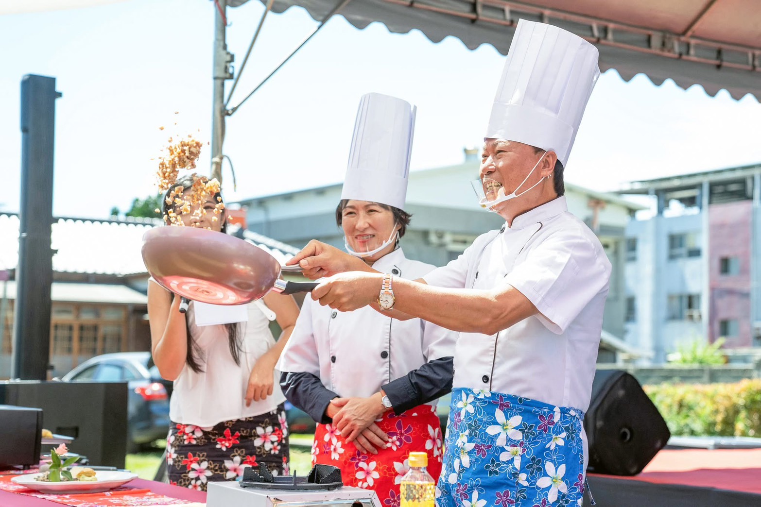 <p>活動中最吸睛的客家料理秀,由市長陳銘風、縣長饒慶鈴與知名主廚高國雄共同下廚。市長熟練翻炒大鍋、邊學習客家料理邊以客語與民眾互動,炒出滿場香氣與笑聲,也透過親身參與表達對客家文化推廣的重視。主廚高國雄則展現專業廚藝與創新巧思,為傳統客家菜注入新元素。</p>