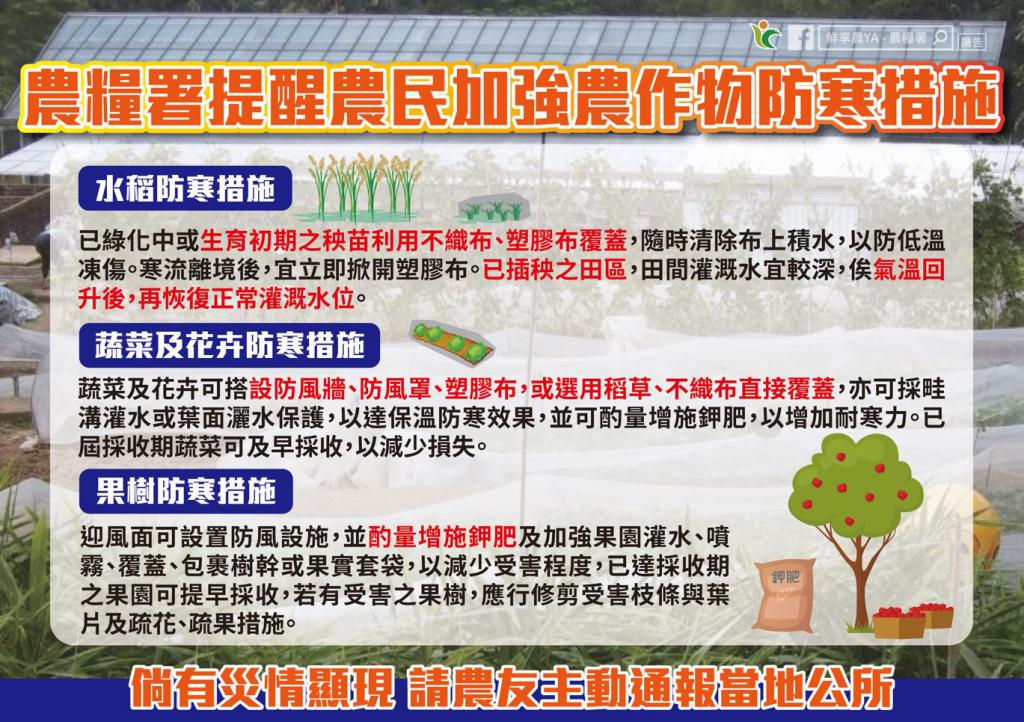 本次寒流溫度下降幅度大,且氣溫偏低,農友務必注意保暖,並避免在清晨氣溫最低時出門,農作物相關防寒措施可在寒流來襲前先做好。
